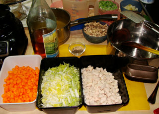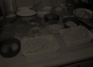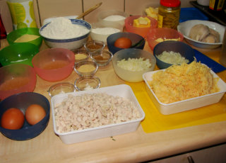 De kip snijden tot dunne reepjes en marineren in de shaorma kruiden met een beetje olie. Er zijn diverse soorten shoarma kruiden, ik neem graag bij de toko de shoarma kruiden, een bakje zonder en 1 met zout en die meng ik dan met elkaar. Snipper het uitje en snijde puntpaprika na het schoonmaken tot kleine blokjes. Maak het flensjes beslag, alles door elkaar roeren en dan de staafmixer erdoor om de klontjes weg te werken en dan laten rusten.